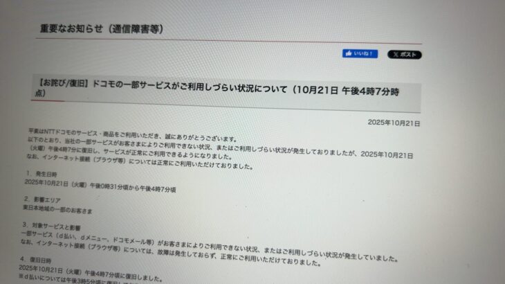NTTドコモは10月21日、d払いやdメニュー、ドコモメールなどの一部サービスで障害が発生していたと発表した。同日午後4時7分に復旧している […]