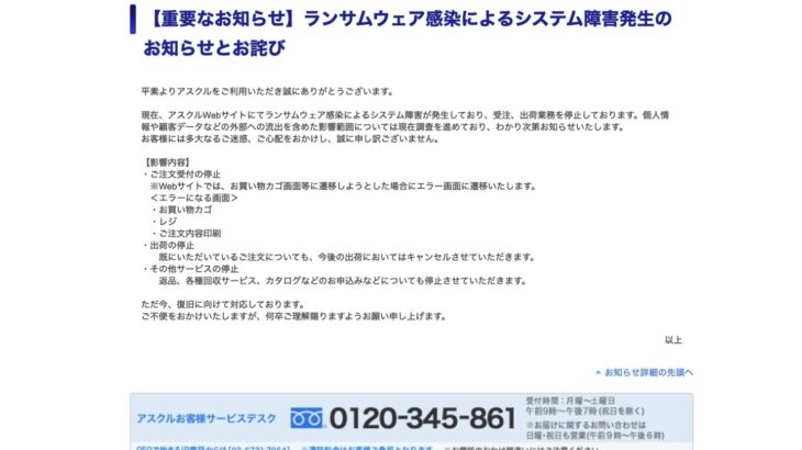 オフィス用品通販大手のアスクルは10月19日、Webサイトがランサムウェアに感染し、システム障害が発生していると発表した。これに伴い、受注お […]