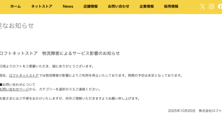 ロフトは10月20日、ECサイト「ロフトネットストア」のサービスを停止したと発表した。配送業務を委託しているアスクルの子会社が物流障害に陥っ […]