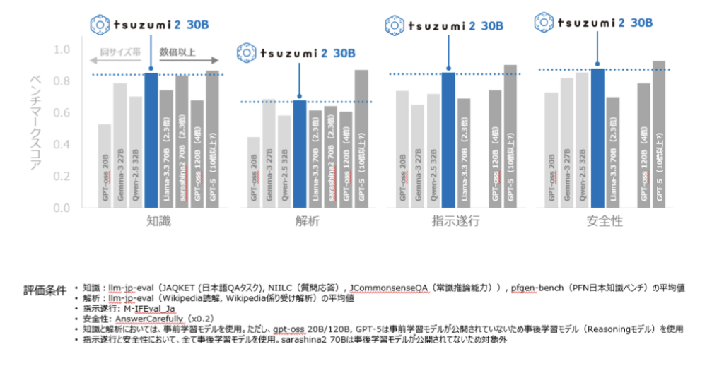 tsuzumi 2は、初代モデルのユーザーから寄せられた「複雑なドキュメントへの理解力強化」「専門知識への対応力向上」といった要望を反映して開発された。同サイズ帯のモデルと比較して世界トップクラスの日本語性能を実現し、知識、解析、指示遂行、安全性といった基本性能では、数倍大きなフラッグシップモデルに匹敵するレベルを達成したという。