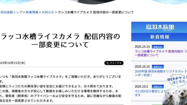 多くの人々に癒やしを届けてきた鳥羽水族館(三重県鳥羽市)の「ラッコ水槽ライブカメラ」が、悲しい理由から配信内容の一部変更を余儀なくされた。同 […]
